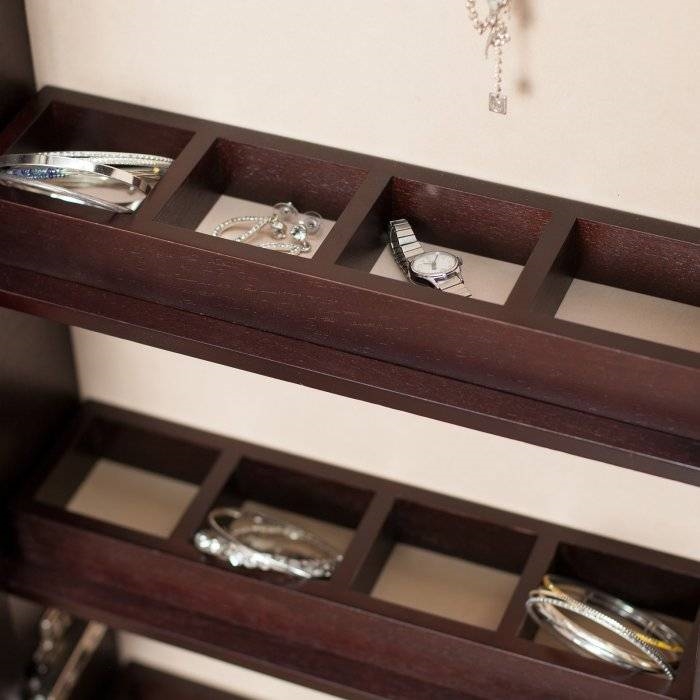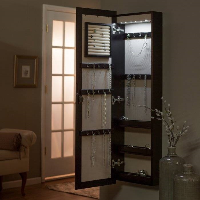 - Wall Mounted Locking Jewelry Armoire with Mirror in Espresso Wood Finish